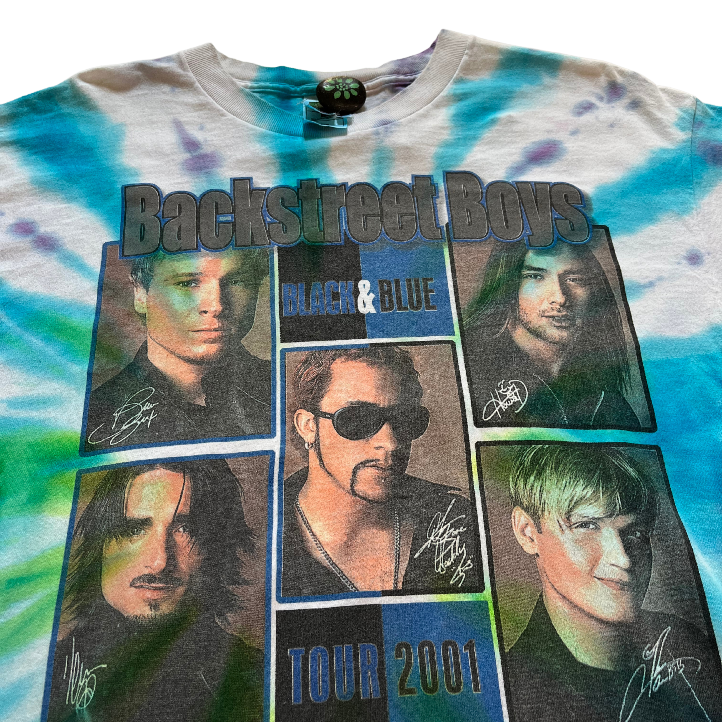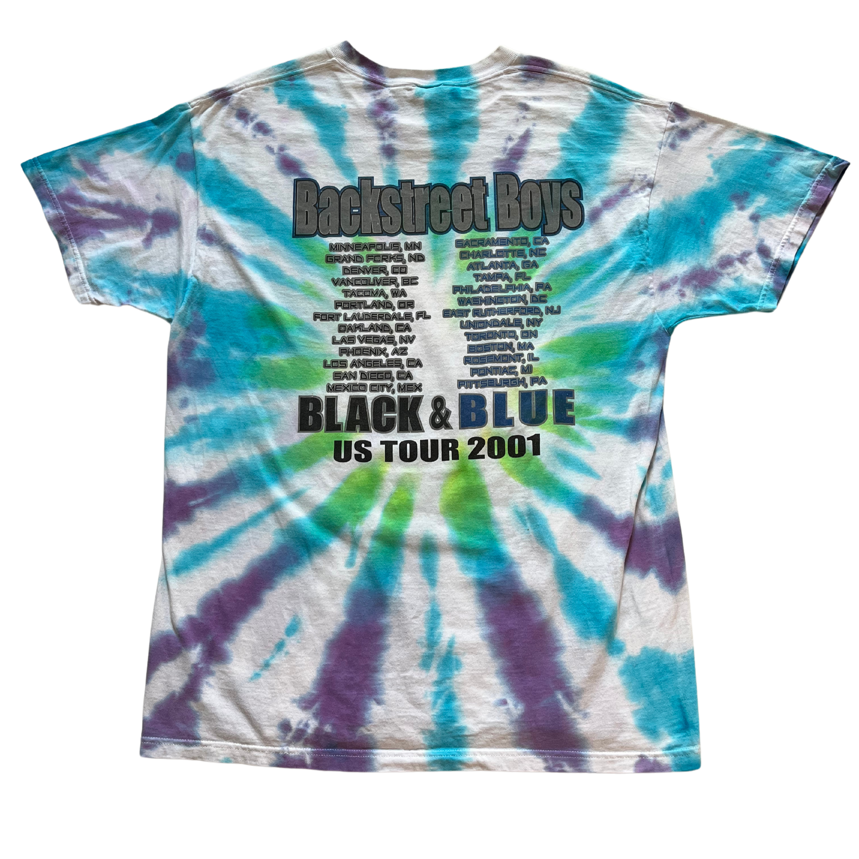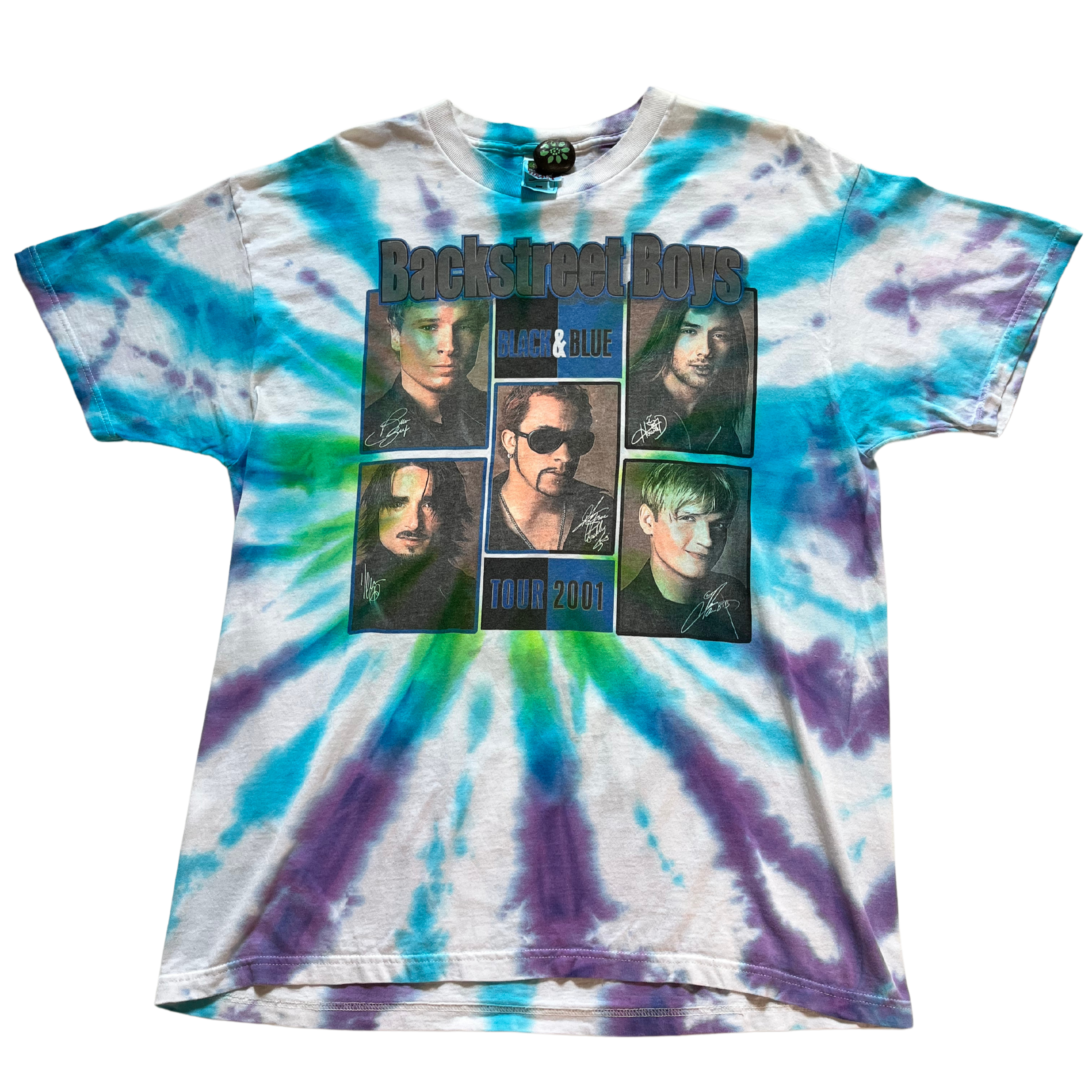 Capture the nostalgia of the Backstreet Boys' 2001 tour with this Fruit of the Loom tie-dye tee. Featuring vibrant colors and the iconic tour logo, it's a must-have for any fan looking to add a retro touch to their wardrobe.