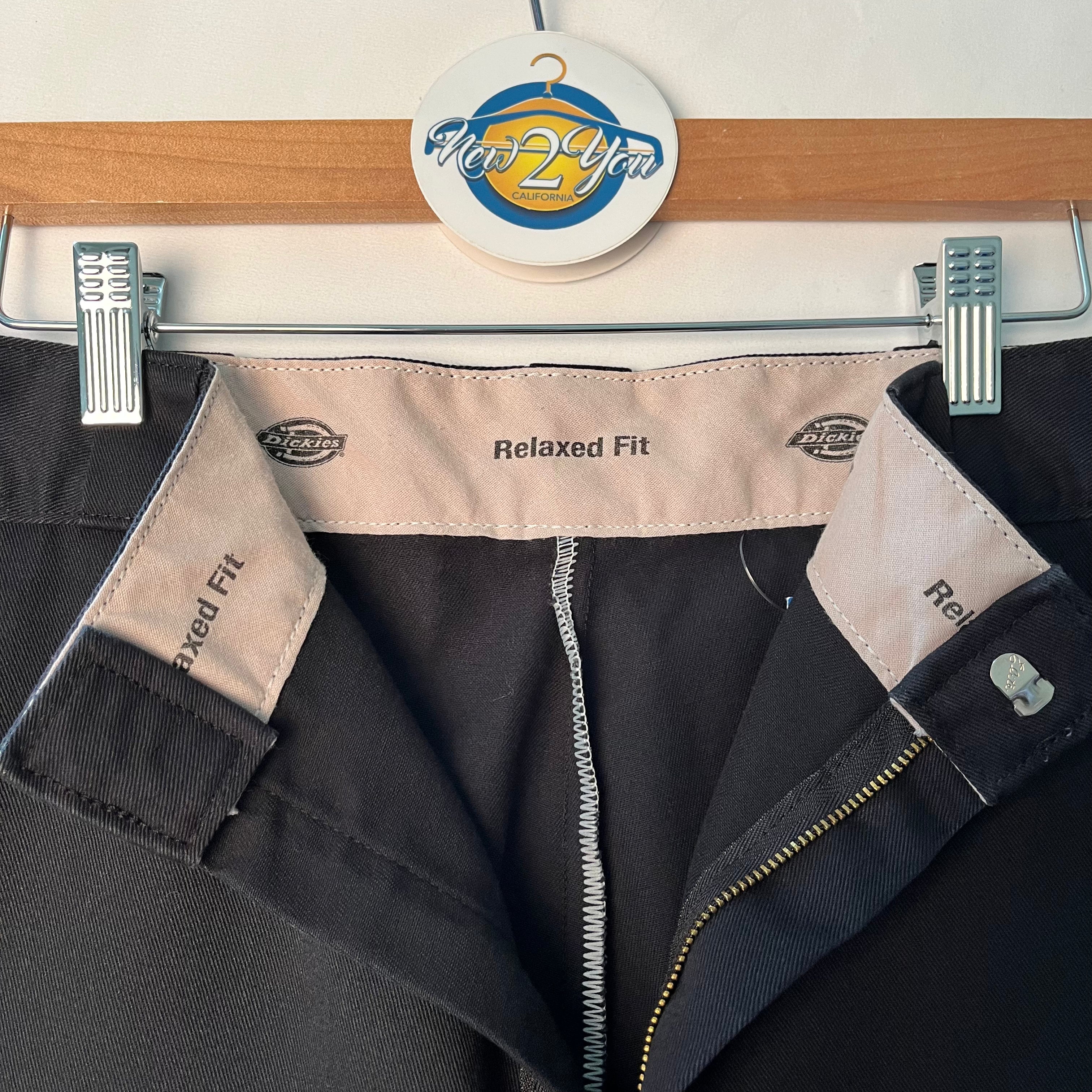 Black relaxed fit shorts with hidden clasp and zipper closure and Dickies logo patch on bottom left pant.