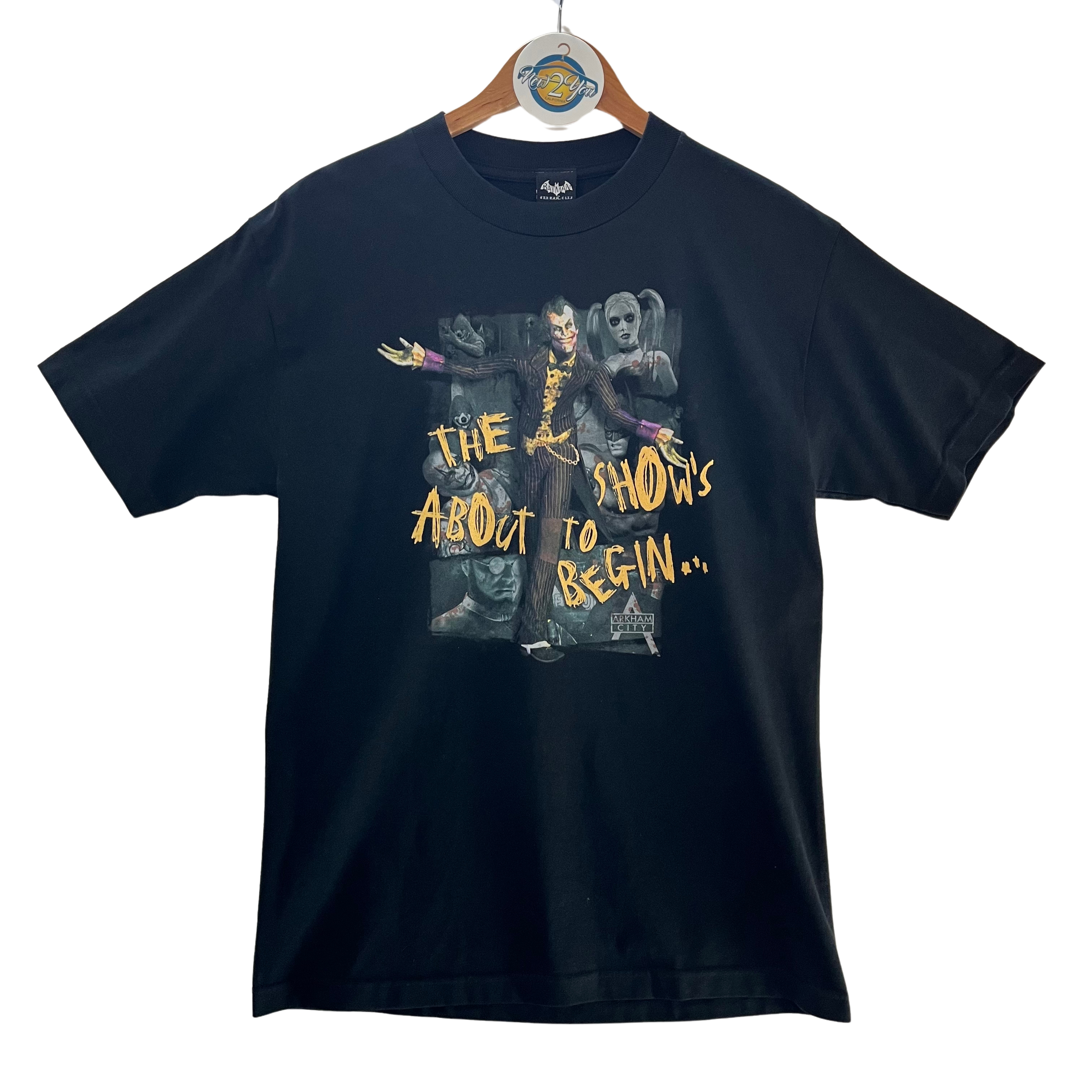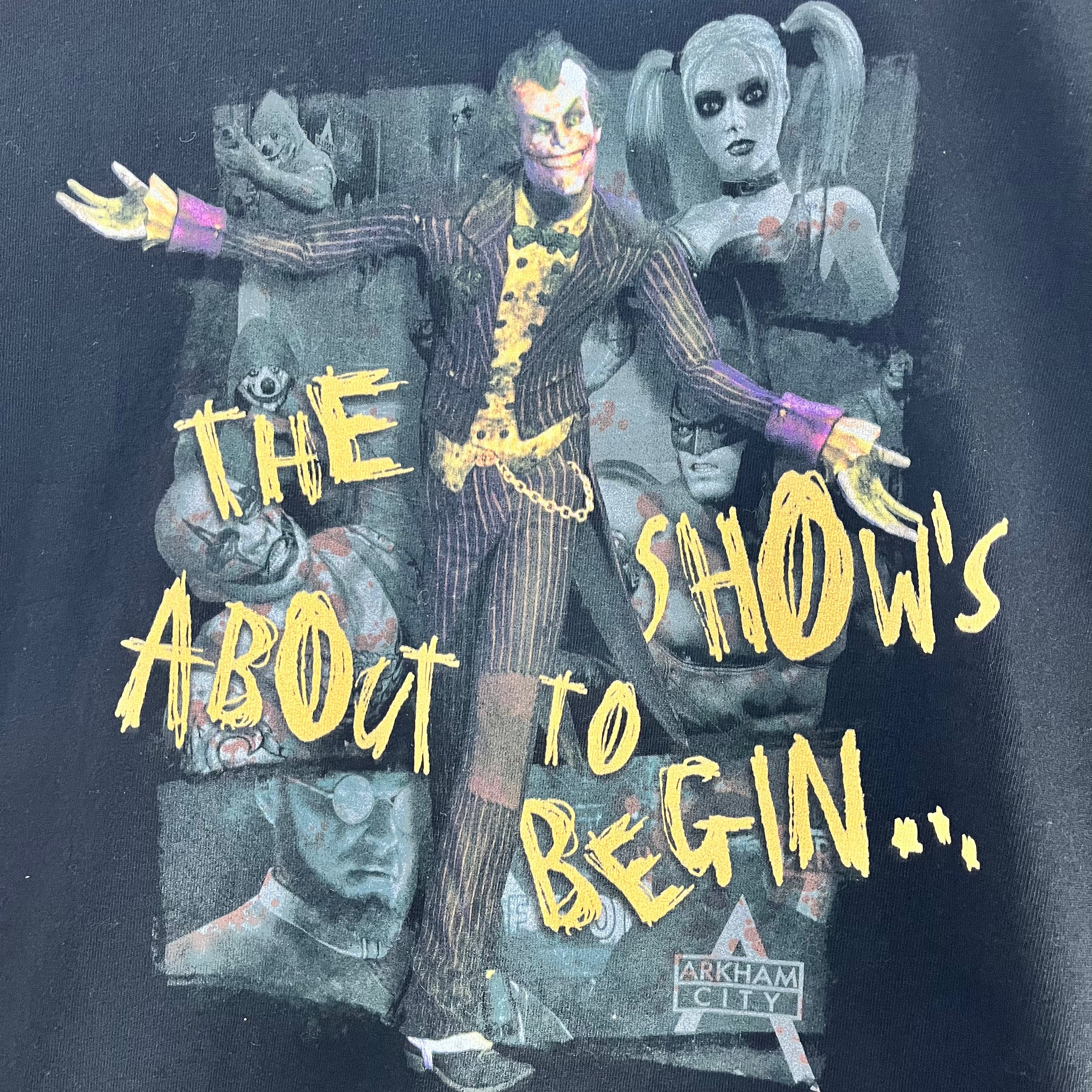 Step into the chaos of Gotham with this Arkham City graphic tee, featuring the Joker and other notorious villains alongside the chilling quote, 'The show's about to begin.'