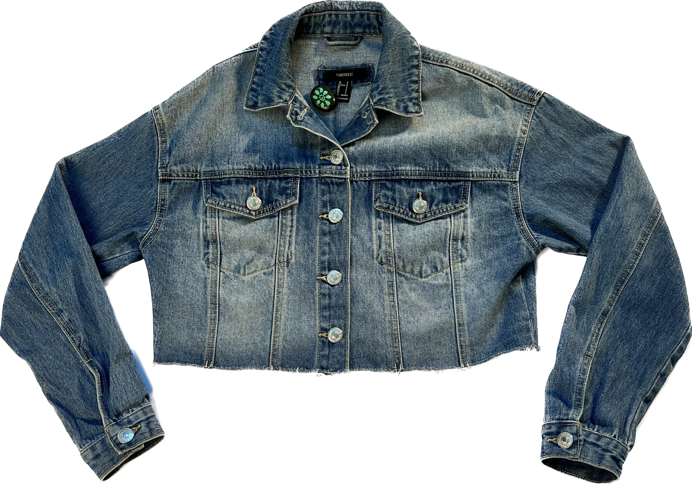 For a laid-back and versatile look, style the Forever 21 Cropped Blue Jean Jacket with a flowy maxi dress and ankle boots. Alternatively, pair it with high-waisted denim shorts and a tucked-in graphic tee for a casual, streetwear-inspired ensemble.