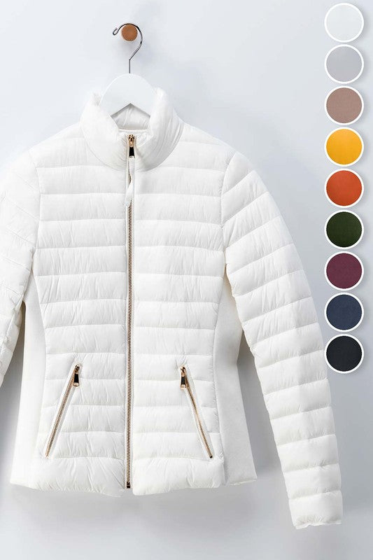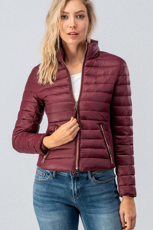 This ultra light stylish puffer jacket with its slim design and gold hardware will have you fashionable and warm all winter.