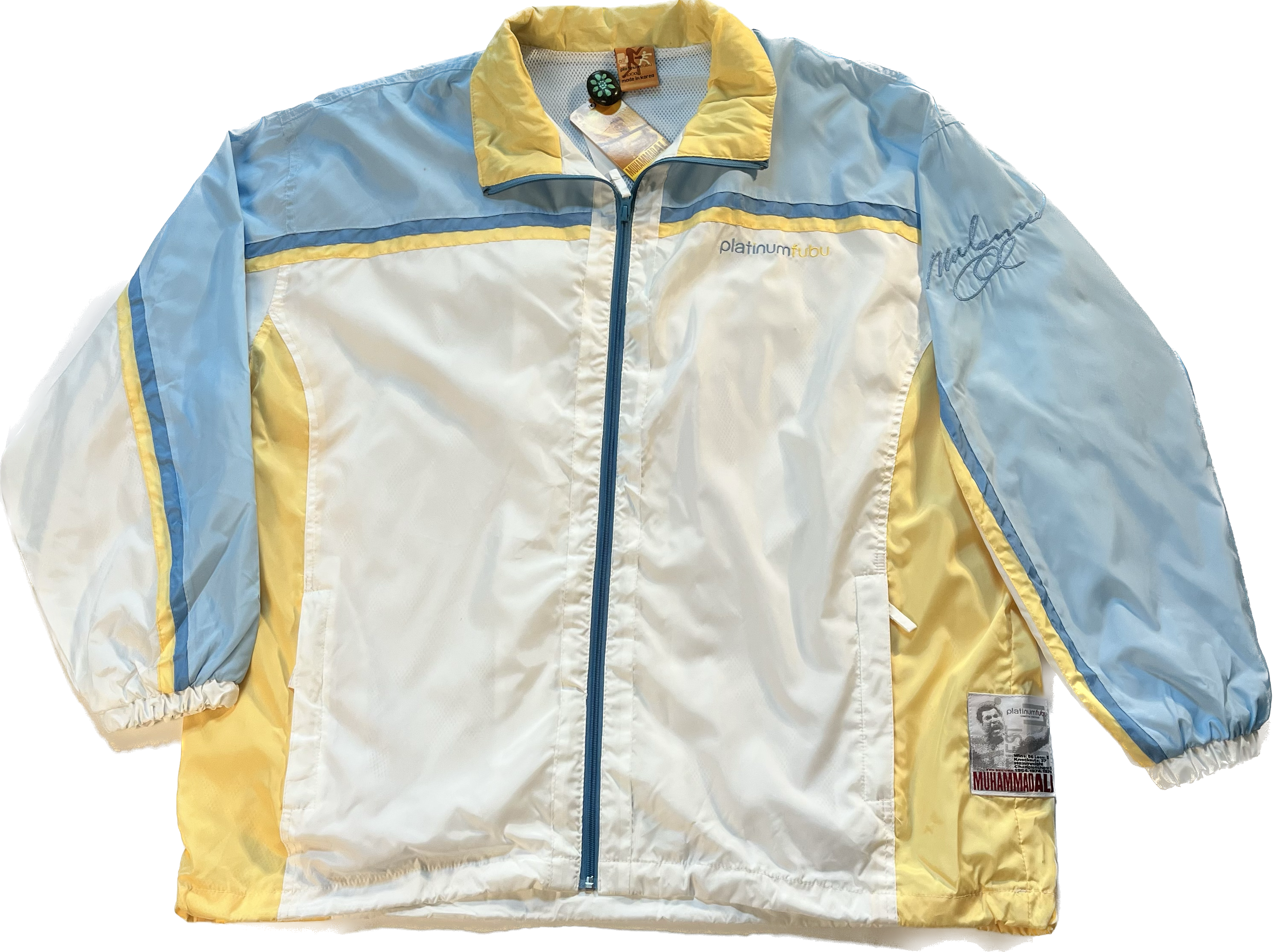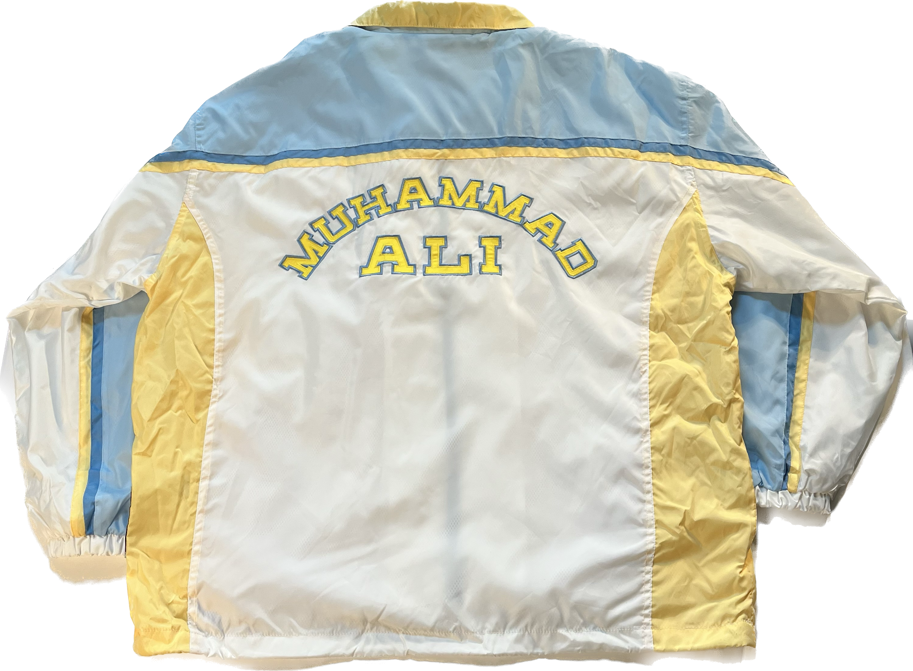 Elevate your style with this rare Vintage Platinum Fubu Muhammad Ali Wind Breaker, a tribute to the legendary boxer. Featuring iconic imagery and bold design, it's a must-have for collectors and fans of both fashion and sports history.
